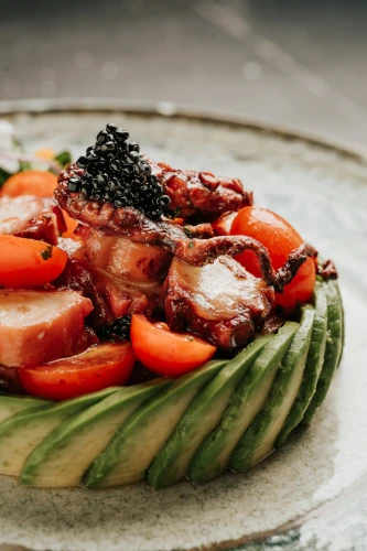 Ensalada de pulpo, aguacate, tomates cherry y cilantro
