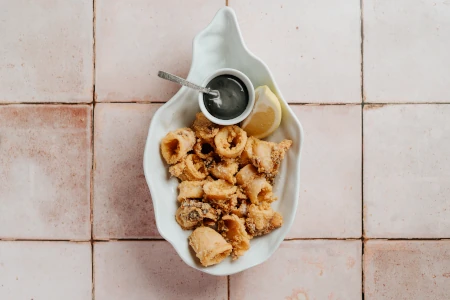 Chipirón crujiente acompañado de alioli negro